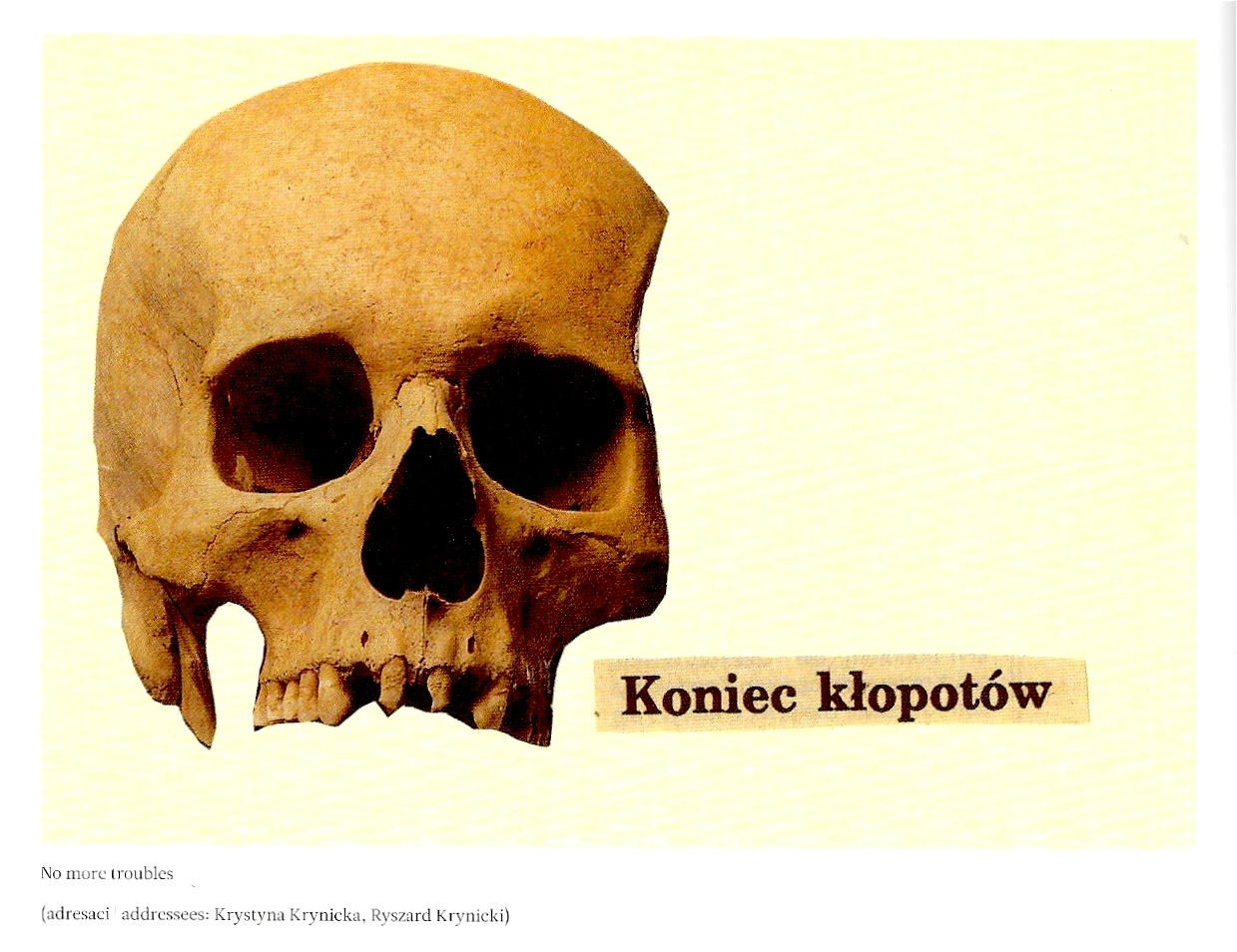 teschio. In basso a sinistra è incollata la frase Koniec kłopotów (Non più problemi) ritagliata da